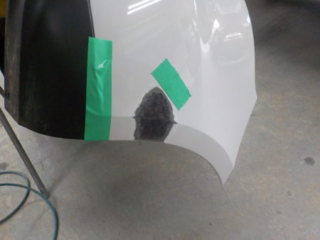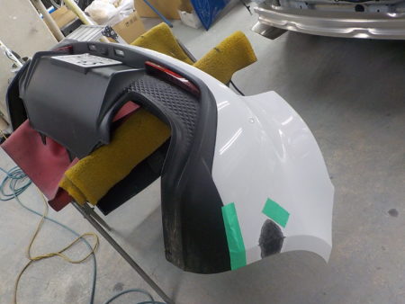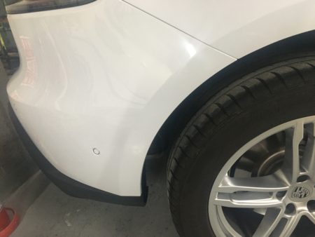 今回に損傷部はリヤバンパー側面部破損、しかもバンパー表面部が貫通して穴あき状態。保険修理でしたら問答無用に交換をと言いたいとこではありますが自費案件で車両はポルシェですので部品代を考えた場合修理で行う事に。